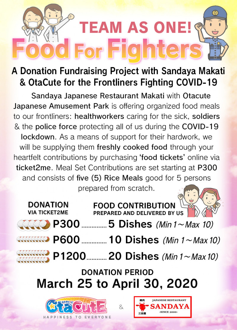 Sandaya YakinikuMakatiとOtacute Amusement Parkは、フィリピン国内にて3月25日(水)より新型コロナウイルス(COVID-19)と闘う医療従事者と病院勤務者および治安維持や住民のサポートに尽力されている警察官や軍関係者に食事を無償で提供・配達を開始しました。4月10日(金)までに18か所に計2000食を届けることができました。